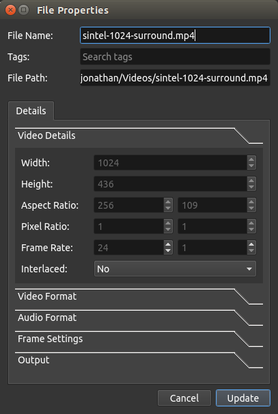 Added a new file properties dialog, which displays all known video/audio details about a file. It also allows the name, tags, and frame start/end to be modified for a file. And, for files without an audio track, it allows the frame rate to be adjusted (useful for animations / image sequences).