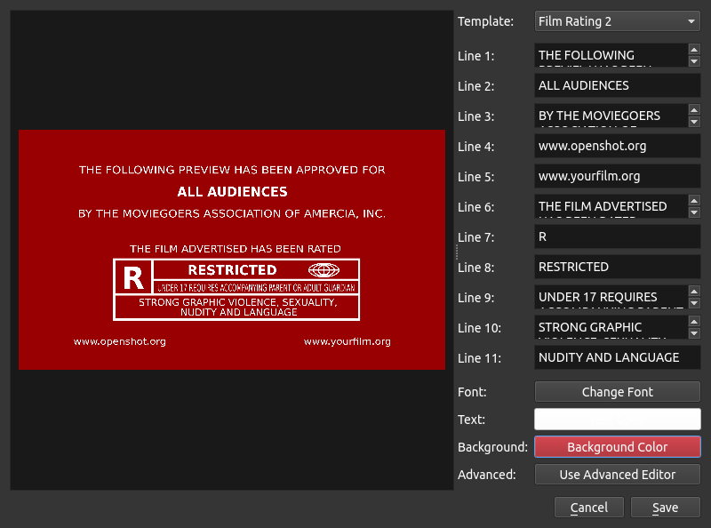 Many Kickstarter backers requested new title templates to be added to OpenShot. I am proud to announce that all new titles are now included in OpenShot 2.2. We have some really nice additions, such as Film Ratings, TV Ratings (small corner rating), and more!