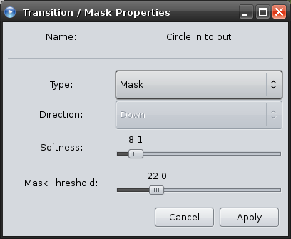 Now let's look at the final setting in the transition properties window, "Mask Threshold". If you imagine a wipe transition, it wipes between 0% and 100%. If you use the circle transition as an example, 10% would be a tiny dot in the middle of the screen (i.e. the transition is only 10% completed), 75% would be a huge circle (revealing much of the lower track). Think of a mask as a transition that never progresses. It sticks to the point you tell it. Small circle, large circle, soft circle, sharp circle, you decide.